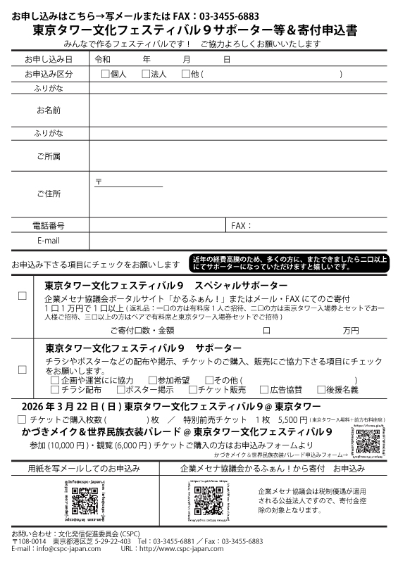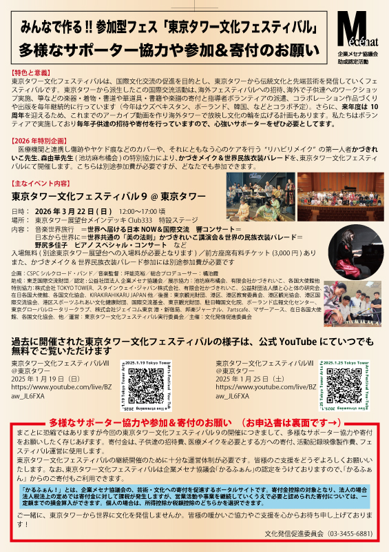 まことに恐縮ではありますが今回の東京タワー文化フェスティバル9の開催につきまして、多様なサポーター協力や寄付をお願いしたく存じあげます。寄付金は、子供達の招待費、医療メイクを必要とする方への寄付、活動記録映像製作費、フェスティバル運営に使用します。