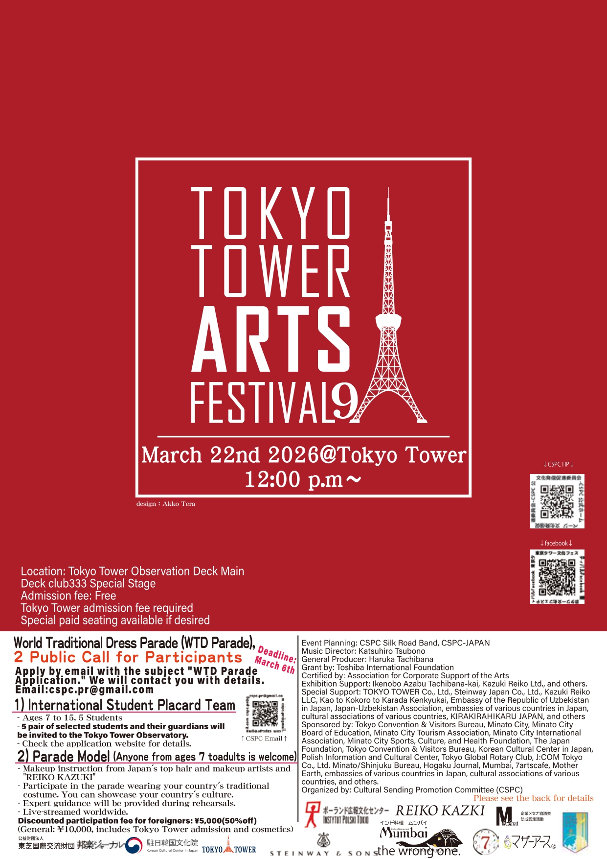 特別協力:株式会社TOKYO TOWER、スタインウェイ・ジャパン株式会社、有限会社かづきれいこ、公益財団法人顔と心と体の研究会、在日各国大使館、各国文化協会、KIRAKIRAHIKARU JAPAN他