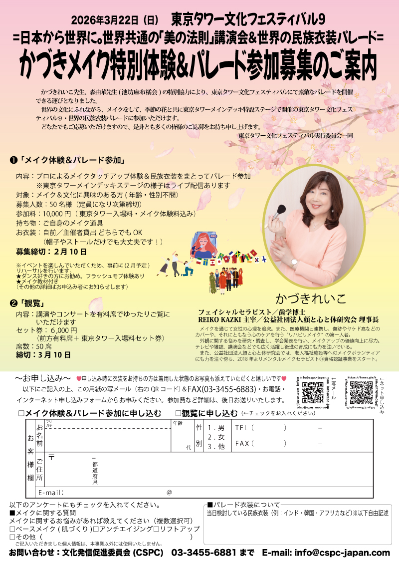 参加料: 10,000円( 東京タワー入場料・メイク体験料込み)